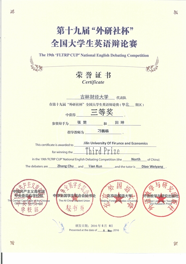 2016Beat365学生在“外研社杯”全国大学生英语辩论赛华北赛区决赛中获三等奖