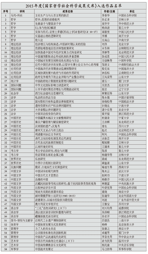 本网讯(记者 郭建辉)近日,在北京召开了2016年度国家社科基金项目评审工作会议,并表彰了2015年度《国家哲学社会科学成果文库》入选作品。全国哲学社会科学规划领导小组成员为刘伟、杜建录、程妮娜等58名作者...