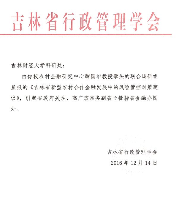 2016金融学院鞠国华教授撰写的调查报告获吉林省常务副省长高广滨的批示
