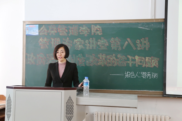 本网讯(公共管理学院 供稿)12月20日下午,公共管理学院在教学楼1237教室举办了管理专家讲堂第八讲,本次讲堂邀请到的专家是吉林省政府采购中心管理办公室主任鄂秀丽博士,报告的题目是“政府采购制度改革的若...