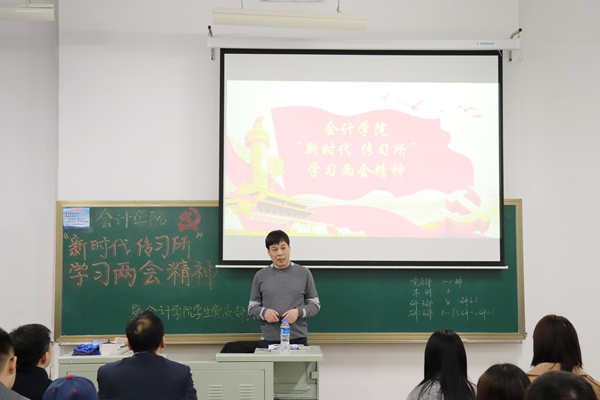 本网讯(会计学院 供稿)为深入贯彻习近平新时代中国特色社会主义思想和认真学习“两会”精神,3月14日,会计学院“新时代传习所”在一教1334教室举行学习“两会”精神专题报告会。会计学院党委书记李金富、党...
