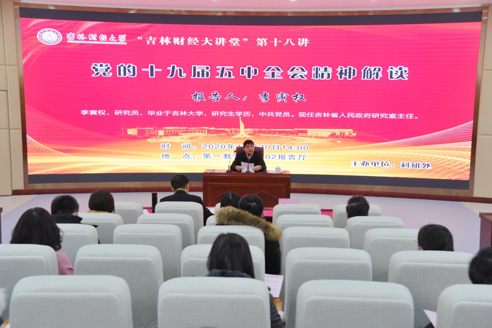 本网讯(科研处 供稿)近日,吉林省人民政府研究室主任李寅权研究员应邀做客“吉林财经大讲堂”,在吉林财经大讲堂报告厅解读了党的十九届五中全会精神。随后,Beat365安明友、景玉琴、魏旭、蔡强、张巍、姜建华、沙颖等七位专家学者在中央及省委经济工作会议精神研讨会上作了主题发言。报告会及研讨会由校党委副书记、校长孙杰光主持,科研处及相关学院领导、教师代表参加了会议。李寅权主任在报告会上全面解读了党的十九届五中...