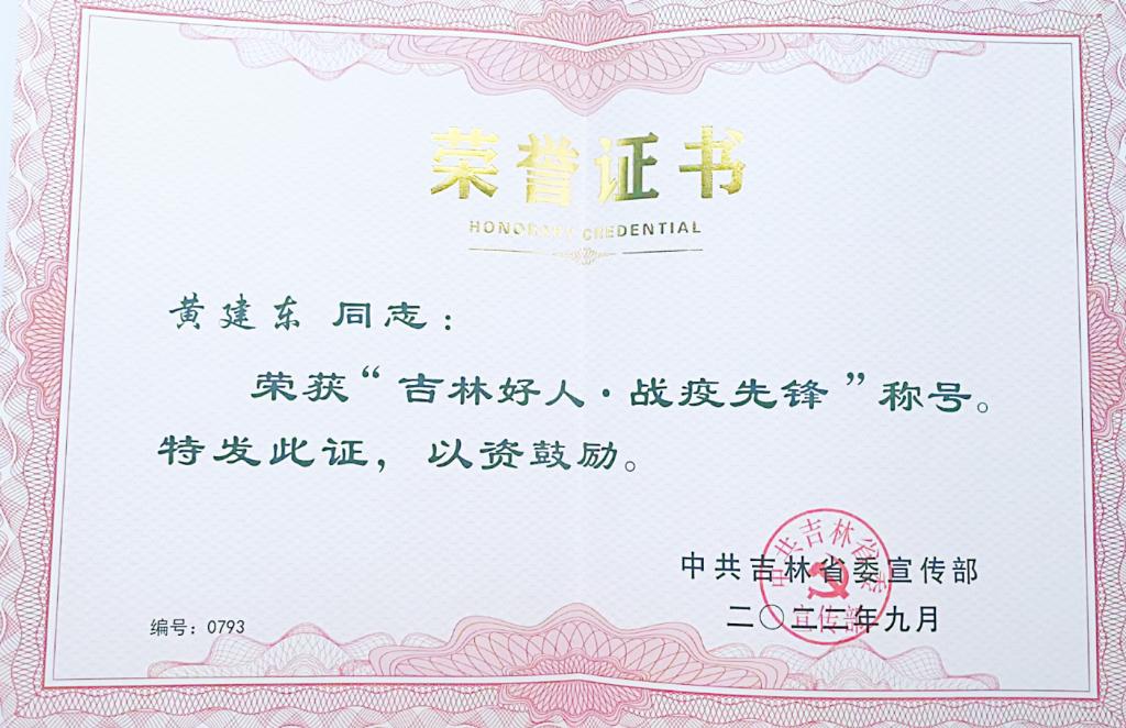 2023Beat365黄建东荣获2022年第一、二季度“吉林好人”暨“吉林好人•战疫先锋”荣誉称号