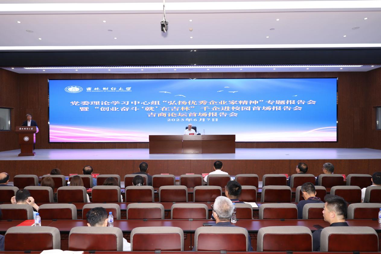 本网讯(党委宣传部 供稿)为深入推进学习贯彻习近平新时代中国特色社会主义思想主题教育,深入学习贯彻习近平经济思想和习近平总书记在企业家座谈会上的重要讲话精神、视察吉林时的重要讲话重要指示精神和历届全球吉商大会精神,6月7日下午,学校党委理论学习中心组“弘扬优秀企业家精神”专题报告会暨“创业奋斗,‘就’在吉林”千企进校园首场报告会、吉商论坛首场报告会在新经济(数字经济)创新创业实训中心报告厅举行。吉...