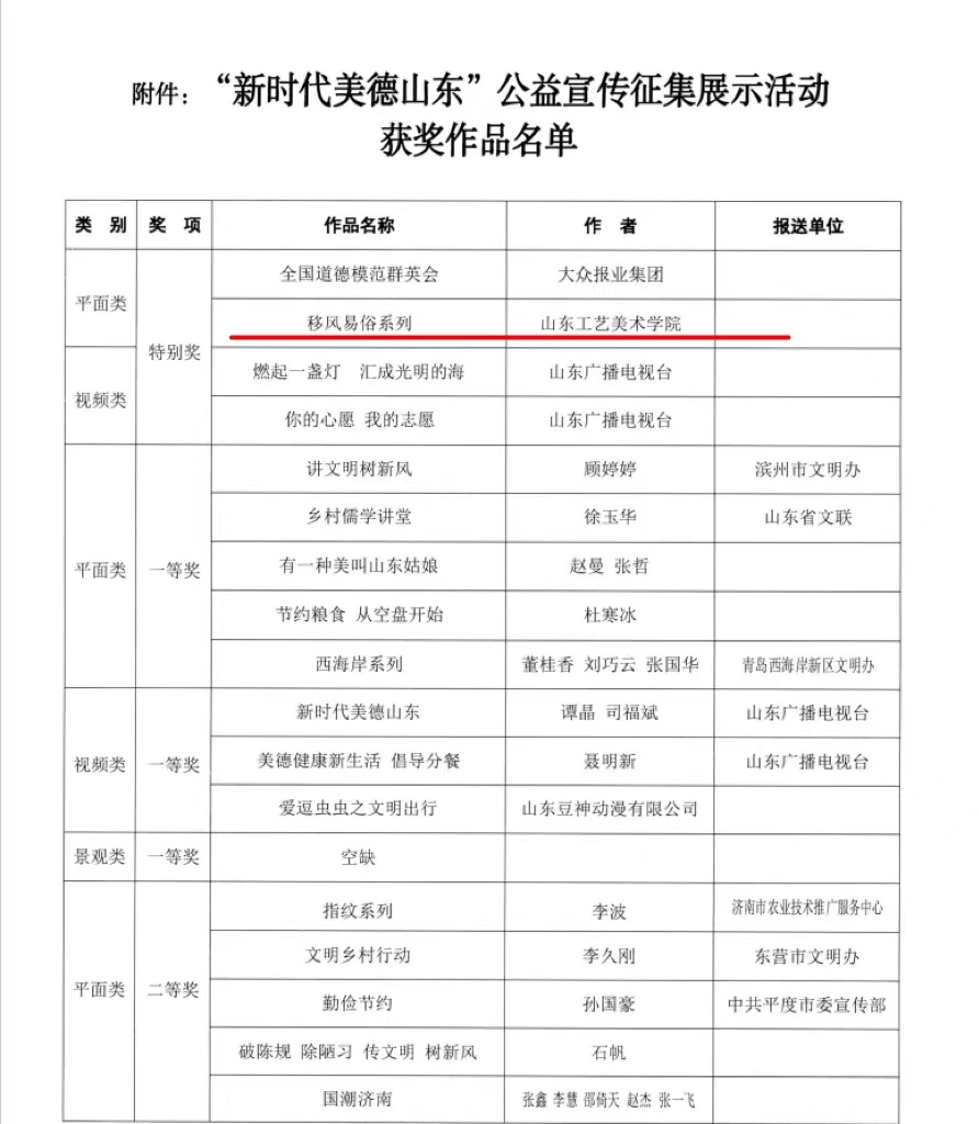 近日,由山东省精神文明建设委员会办公室主办、中国山东网承办的“新时代美德山东”公益宣传征集展示活动获奖名单揭晓,永利官网师生在本次活动中喜获佳绩,荣获特等奖1名,一等奖1名,三等奖3名,优秀奖5名,学校被评为优秀组织单位。
