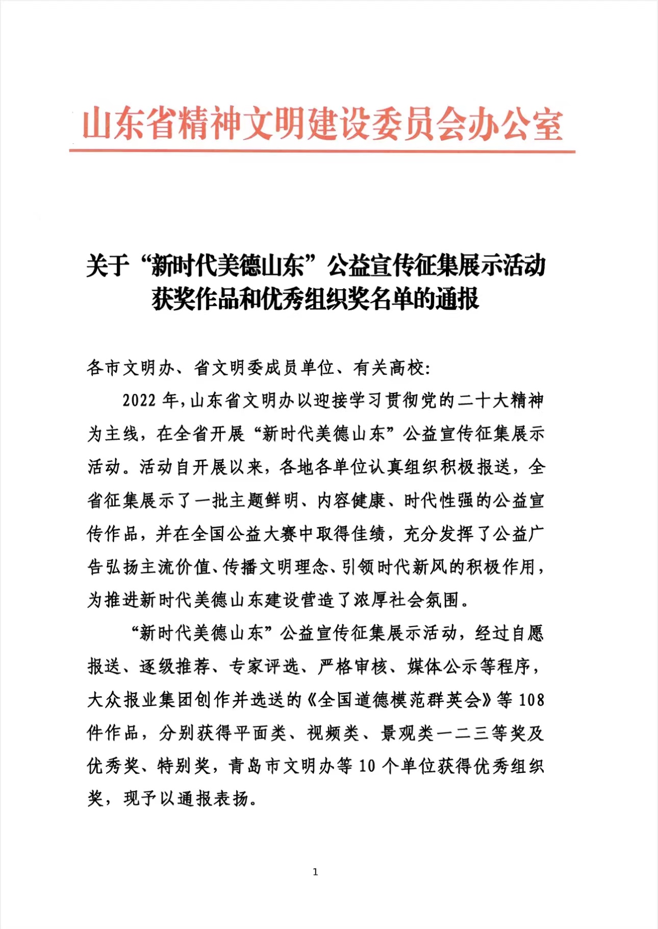 据悉,“新时代美德山东”公益宣传征集展示活动是以迎接学习贯彻党的二十大精神为主线,在全省开展的公益宣传征集展示活动,截至2022年底,共收到报送作品6925件,入围712件,经过逐级推荐、专家评选、严格审核、媒体公示等程序,评选出一二三等获奖作品54件,优秀奖50件,特别奖4件,优秀组织奖10个。