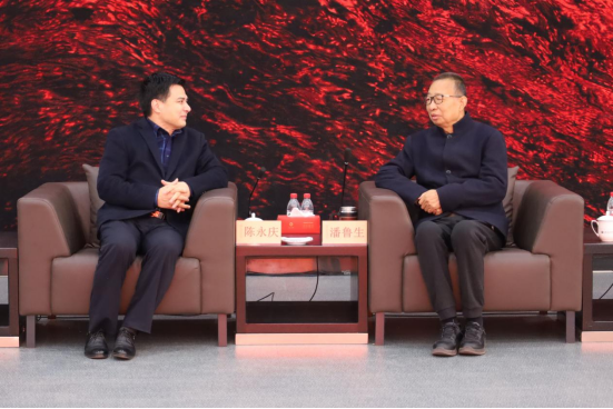 潘鲁生对陈永庆一行表示欢迎,简要介绍了学校的办学理念以及学科建设、专业特色、人才培养、社会服务等方面的情况,并着重交流了学校在传统文化资源转化、传统民间工艺资源的当代活化与创新创造、产教融合与服务“两创”等深入贯彻国家和山东省重大发展战略方面所取得的积极成果。关于下一步工作,潘鲁生指出,一是依托双方优势资源,共建文创产业研发平台。中央广播电视总台山东总站作为行业传播平台翘楚,希望深入开展合作,以总台为平台基础,结合学校文化创意智力资源优势,共建文创产业园区与文创研发机构,建设集展示销售、研发发布、研学体验、版权交易等一体的文创展示、体验和销售平台,将总台和地方文创资源融聚汇集,打造具有国际化视野、山东文化底蕴特色的文化交流与输出平台。二是充分发挥总台平台传播力,服务文化创意产业发展。将兼具实用价值、文化价值和艺术价值的创新传统工艺产品,通过总台相关平台进行宣传、推广,进而开拓创新、形成完整的产业集群,推动中华优秀传统文化创造性转化、创新性发展,将山东文化资源大省转变为文化创意产业大省,共同推进“山东手造”区域公共文化品牌建设。