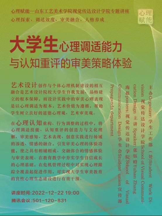 12月22日,yl8cc永利官网学生工作部(处)、视觉传达设计学院联合举办“心理赋能”素质教育专题线上讲座,以《大学生心理调适能力与认知重评的审美策略体验》为主题。学生工作部(处)张钰晗老师主讲。