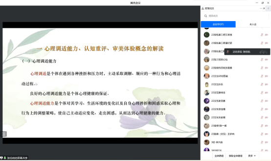 张钰晗老师以融合心理健康、审美体验的概念入题,对心理调适能力、认知重评、审美体验进行详尽解读。对建构自我心理调适能力的内因、外因;社会多元文化背景下心理调适能力建构策略;心理调适能力与审美体验的建构意义进行了详细阐述。同时提出了社会多元文化背景下心理调试能力建构与审美体验策略的三个着力点,即保持积极的自我认知、有效调节自我情绪、提高自我意志力。讲座中融合生动有趣的案例小剧场,加深了同学们对合理运用心理调适能力与审美策略体验的理解。