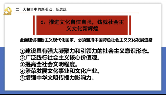 邢凯以《学习贯彻党的二十大精神》为主题,重点从“二十大报告的基本内容”和“二十大报告中的新观点、新思想”两个方面展开宣讲。围绕“党的二十大报告的基本框架、主要内容、大会主题”等内容进行深入讲解,结合习近平总书记提出的“五个牢牢把握”,深入分析自党的二十大以来历次大会的报告题目和深刻内涵,从而全面认识大会主题的伟大意义。在解读二十大报告中的新观点、新思想时,着重从“十年来的‘三件大事’,‘三个务必’,跳出历史周期率的第二个答案,中国式现代化的五个特色,全面建设社会主义现代化国家的基础性、战略性支撑,推进文化自信自强、铸就社会主义文化新辉煌”六个方面进行讲解,并从脱贫攻坚、科研教育的发展等方面列举我们国家发展壮大的伟大历程。讲座最后,邢凯提出“思政与艺术的思考”观点,讲述在艺术创作中,如何探索、挖掘作品背后的红色故事和红色力量,开创艺术和思政相结合的新模式。