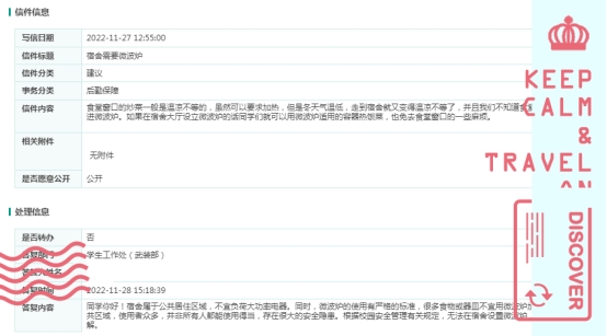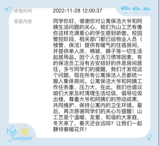 2022年11月26日,“工美12345”正式上线。通过“你反映,我来办”的形式,努力打造线上反映、线下办理的师生诉求快速办理通道,让师生表达、师生参与、师生监督的途径和渠道等更加顺畅、更为有力。上线一周以来,共受理各类师生群众反映事项百余件,对于师生员工提出的咨询建议和投诉事项,学校相关部门一站式快速办理,结果可查询、可评价、可督办、可考核,架起了一座紧密联系师生的“同心桥”。