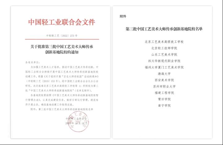 会上举行了“中国工艺美术大师传承创新基地院校”授牌仪式,中国轻工业联合会党委常委、纪委书记陶小年宣读了《关于批准中国工艺美术大师传承创新基地院校》的通知,yl8cc永利官网、西安美术学院等11所院校获批“中国工艺美术大师传承创新基地院校”。