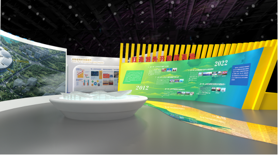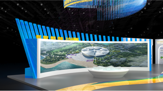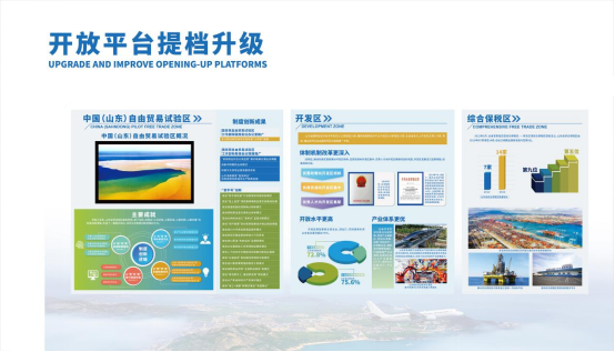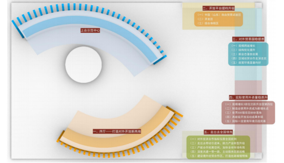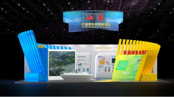 展板方面共分为“序厅+特色板块”5个区域。序厅展示十年来山东打造对外开放新高地取得的成果。外围为平台、贸易、外资和走出去四大特色板块,分别展示对外开放平台;对外贸易的新业态、新模式、新成果;山东优势产业、引资项目、招商引资政策环境;山东共建“一带一路”和推动企业“走出去”取得的丰硕成果等四部分内容。整个展区设计聚焦山东高质量发展,主动服务国家开放大局,打造对外开放新高地的伟大愿景。