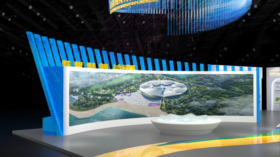 展区多媒体设计由LED弧形巨幕展演与“上合之珠”数字沙盘两大部分组成。屏幕主要放映青岛上海合作组织地方经贸合作示范区专题片,并与“上合之珠”数字沙盘进行交互联动,对“上合之珠”进行分模块数字交互展演。
