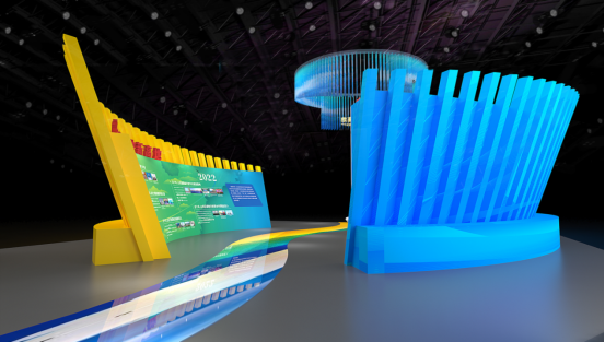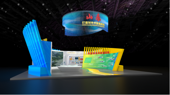 展区整体造型衍生于展区的主视觉形象。设计方面采用多线条组合的形式以及放射状的形态,寓意开放、多样与活力四射的进出口产业形态。展区内由弧线、曲线及丰富的流线组成,黄蓝结合寓意“黄河入海”,蕴含“开放”与山东积极主动融入共建“一带一路”,推动企业“走出去”,主动服务国家开放大局的理念。