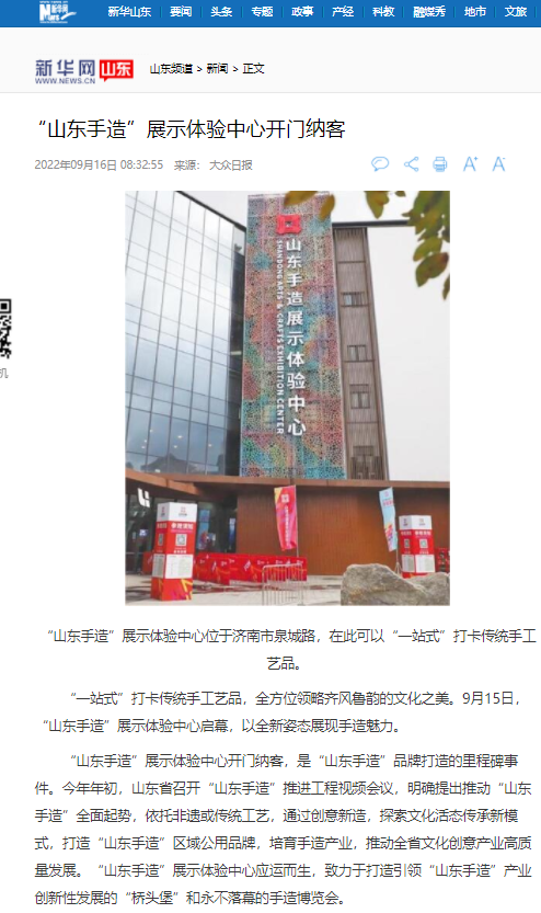 2.新华网·“山东手造”展示体验中心开门纳客http://www.sd.xinhuanet.com/news/2022-09/16/c_1129006532.htm