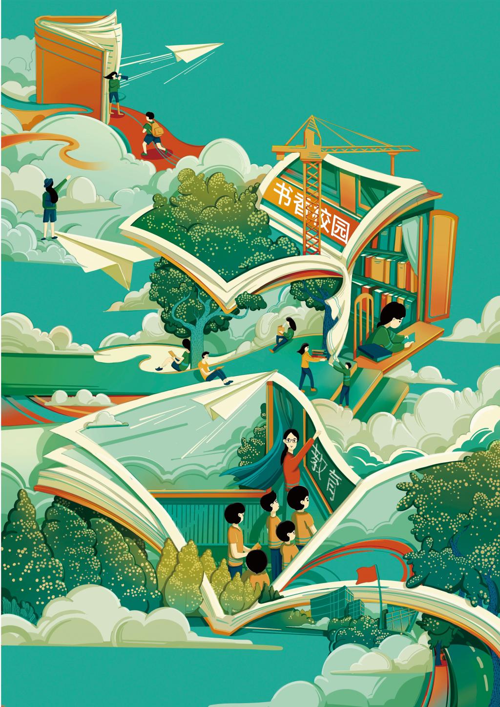 画面采用混维和矛盾空间相结合的图形表现手法,将书香校园中的多个场景组合到一起,让画面形成一个个充满想象力的空间。