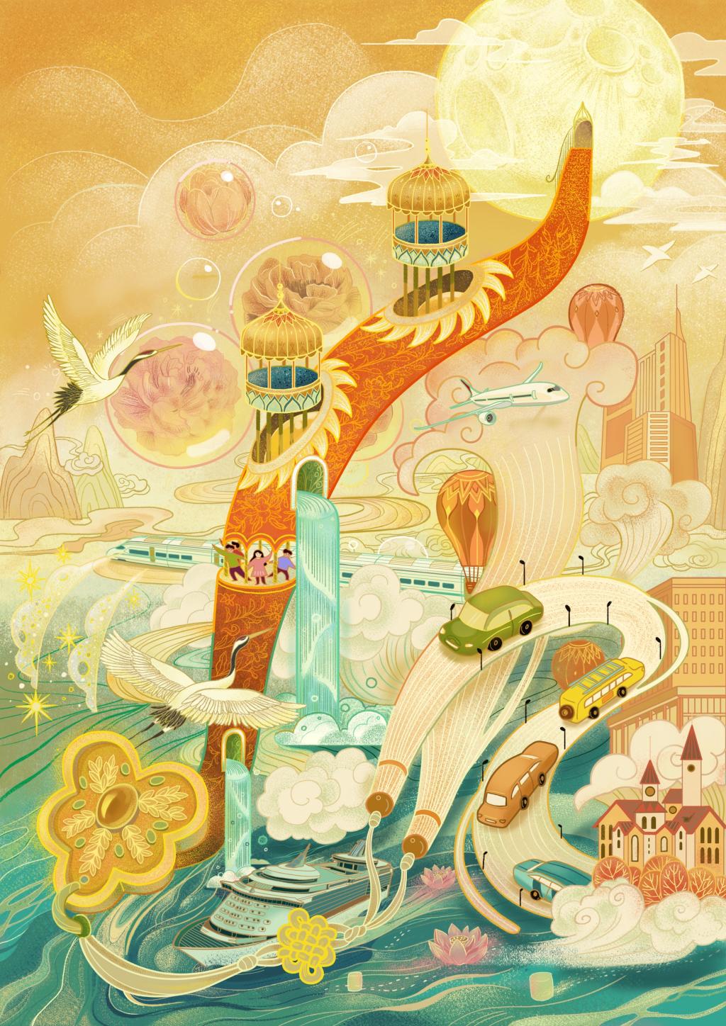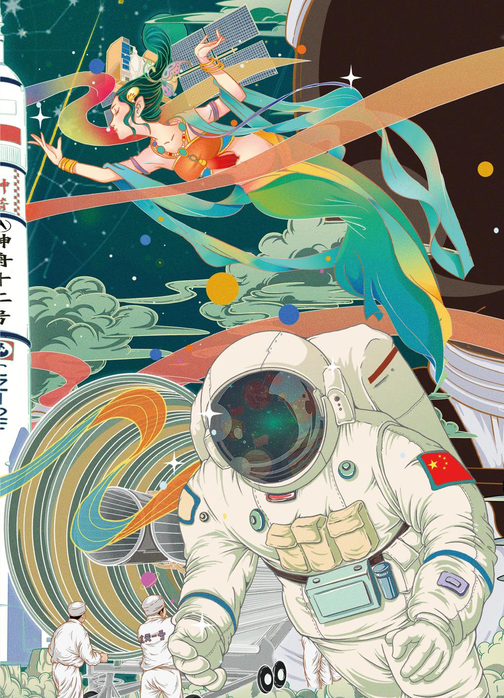 探索浩瀚宇宙,发展航天事业,建设航天强国,是中华民族不懈追求的航天梦。为了这个航天强国梦,无数的航天人艰苦创业、奋力攻关,取得了连战连捷的辉煌战绩。该插图以我国航天事业的发展为主线,将我国古代神话飞天故事与重大航天事件节点结合起来,通过提炼视觉元素,以插图的方式致敬不忘初心、用实际行动践行中国梦的航天人。