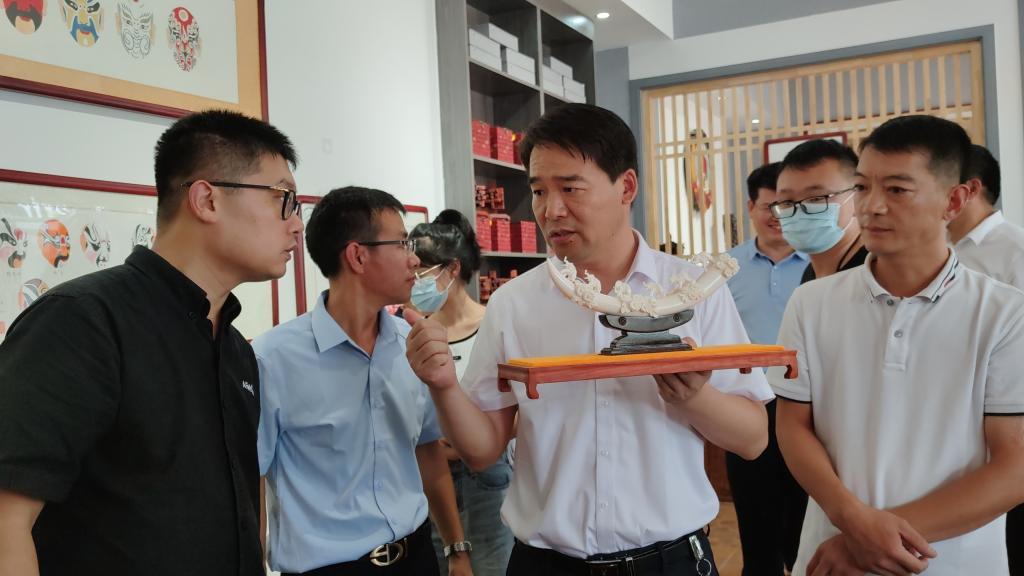 在无棣县,调研组在无棣县委常委、宣传部部长、副县长徐鹏潇等同志的带领下,实地参观了山东海瓷文化股份有限公司及古城盐坊、绣坊、陶坊三大工坊,与相关企业负责人深入交谈,详细了解企业生产经营情况,就黄河流域民俗文化无棣县手造企业的发展目标、方向和举措进行深入调研和探讨。调研组在研究海洋贝瓷与黄河泥陶的创意点的同时指出,可在产品做精做细的基础上,扩大品类影响力,重视原材料在陶瓷艺术创作中的重要性,在做到体现山东特色的基础上设计制作出更多符合当下社会的艺术生活用品。