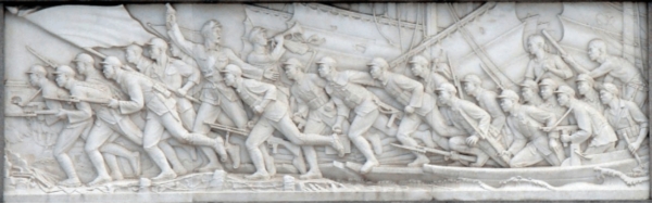 浮雕“胜利渡长江”,这是十幅浮雕中最大的一幅。国民党认为不能逾越的天堑长江,被英勇无敌的人民解放军胜利地渡过了。浮雕上,号兵吹起冲锋号;指挥员右手高举,连连向高空发射信号弹,已登上敌岸的战士,踏着反动派的旗帜,向国民党反动统治的老巢冲去。背后,数不清的战船正在波涛中前进。