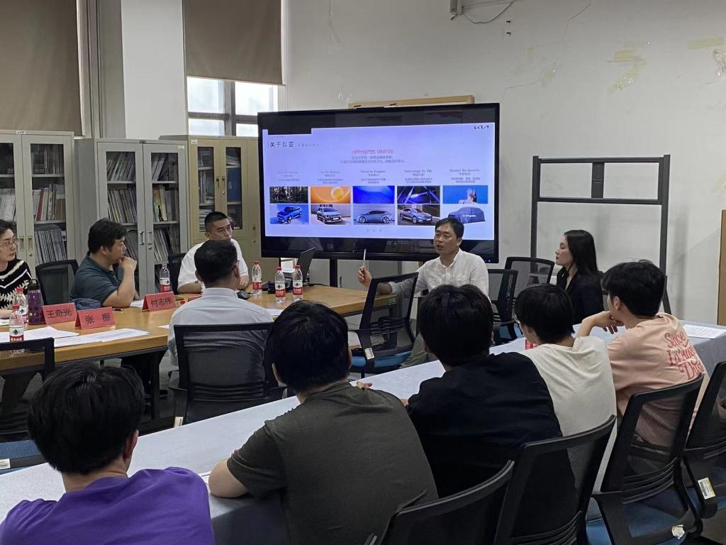 工业设计学院党总支书记王玉杰向企业介绍了学院的基本情况,并赠送了学院宣传册;起亚造型设计部总负责人金致暎介绍了公司情况、用人需求和合作意向。