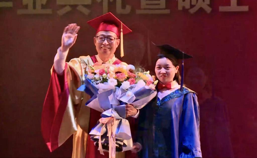 伴随着欢快的校歌,潘鲁生为毕业生逐一扶正流苏、颁发学位证书。