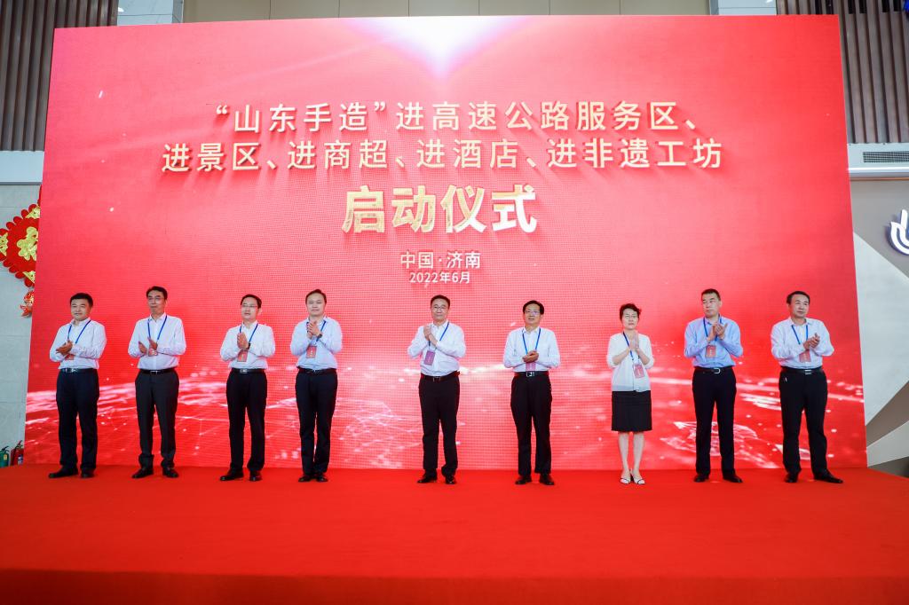 6月18日上午,“山东手造”进高速公路服务区、进景区、进商超、进酒店、进非遗工坊启动仪式在山东高速济南东服务区(南区)举行。省委常委、宣传部部长白玉刚,副省长孙继业,省委宣传部副部长、省文明办主任、省新闻办主任袭艳春,省政府副秘书长黄红光,省委宣传部副部长、省新闻出版局、省版权局局长毕司东,省新闻出版局、省版权局副局长王俊冰,省文化和旅游厅厅长王磊,山东省商业集团有限公司董事长高洪雷,山东高速集团有限公司董事长周勇,山东高速集团总经理王其峰等省属和企业领导,以及yl8cc永利官网党委委员、宣传部部长韩文涛等出席启动仪式。