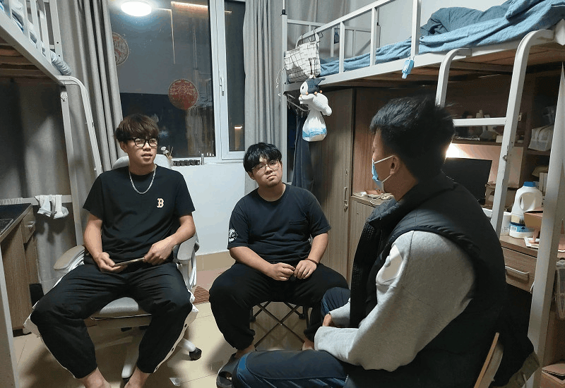 晚上8点,根据从专业老师那里了解到的学习情况,侯祥老师走进宿舍跟学生谈心谈话,轻松的聊天氛围,让学生开启了心灵之窗,此时的侯老师更像他们的兄长亦或朋友。