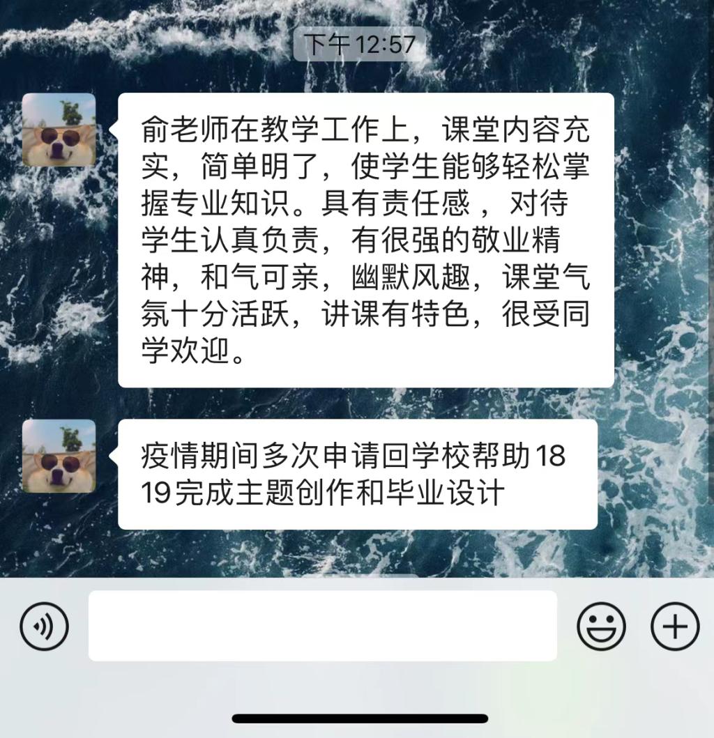 在同学们的眼中,俞老师是个尽职尽责的好老师。正如2018级陶瓷班班长赵洛严同学所说:“他为班级和同学们所做的一切大家都看在眼里,记在心里,他用爱温暖、感动着每一个学生。”