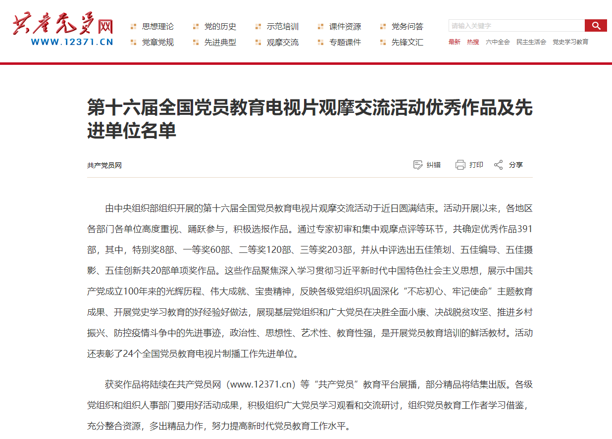 近日,由中央组织部组织开展的第十六届全国党员教育电视片观摩交流评活动圆满结束,永利官网拍摄制作的《百年风华》获得新媒体课件类三等奖。本次活动由中组部主办,经过专家初审和集中观摩点评等环节,共评选出391部优秀作品,包括特别奖作品8部,一等奖作品60部,二等奖作品120部,三等奖作品203部。