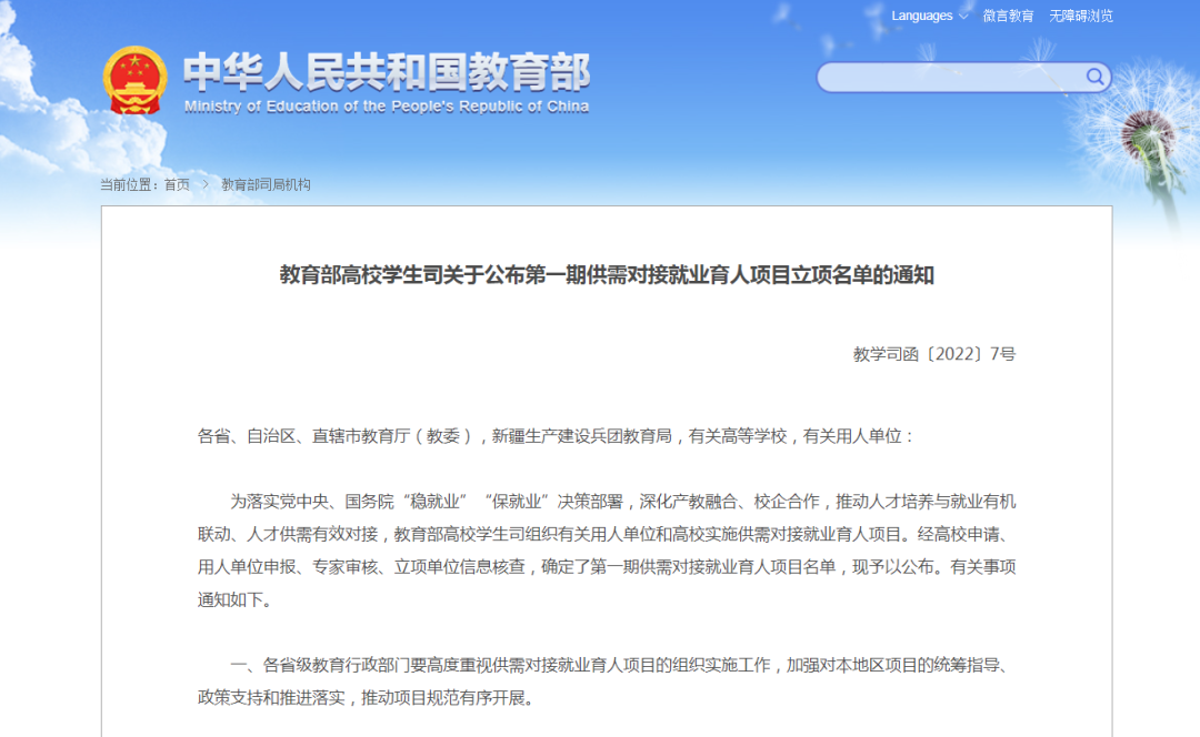 据悉,教育部今年首次实施供需对接就业育人项目,旨在落实党中央、国务院“稳就业”“保就业”决策部署,推动高校人才培养与就业有机联动、人才供需有效对接。教育部高校学生司自去年12月起,组织有关用人单位和高校实施供需对接就业育人项目,经学校申请、用人单位申报、专家审核、立项信息核查,确定了第一期供需对接就业育人项目名单。