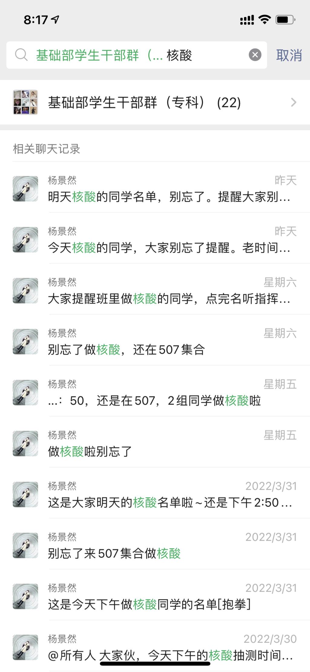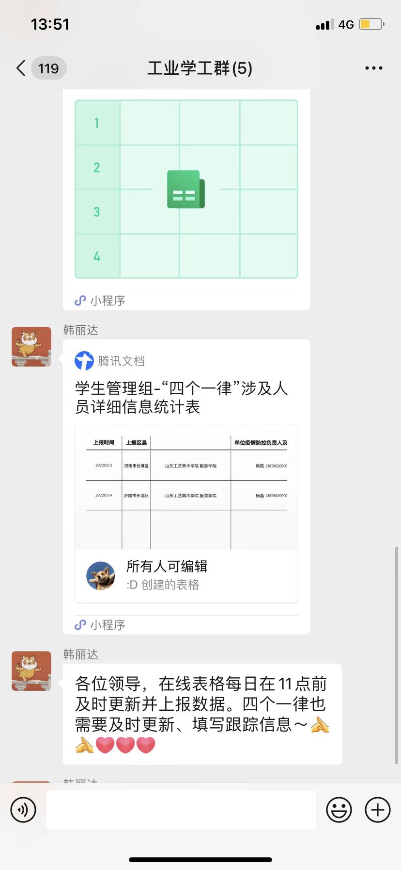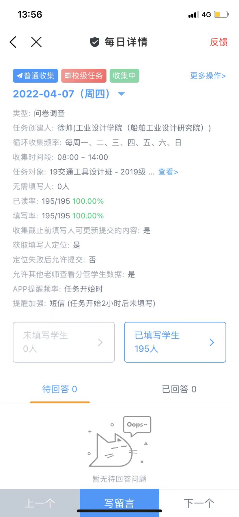 他们每天组织学生做核酸检测,核对名单人数,确保应检尽检。每天上午8点至下午14点,晚上21:45至22:45,是学生健康打卡和宿舍查寝填报时间,他们通过今日校园、辅导猫的“每日疫情上报”和“查寝”功能,督促学生主动、如实、准确报告个人信息,及时了解学生归寝情况,遇到联系不上、忘记打卡的同学,辅导员与班级小助手有时还会用“花式打卡”的方式引导大家报平安,确认安全,精准填报。