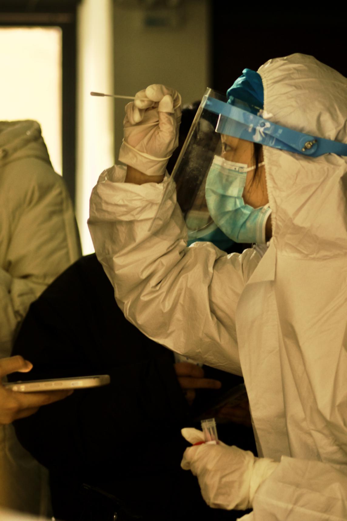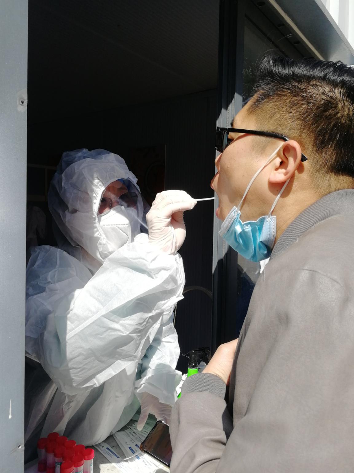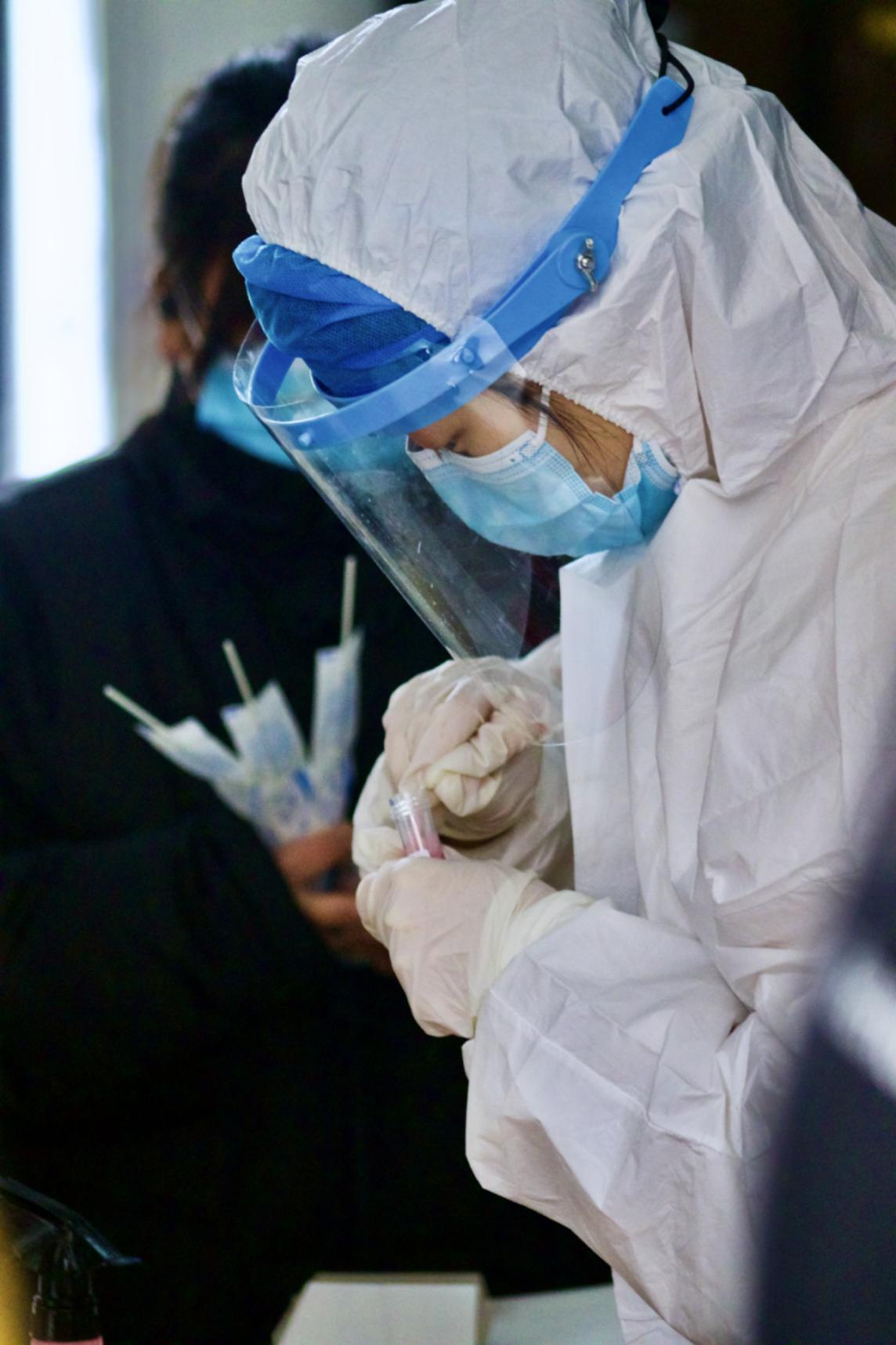 他们每天拿着棉拭子在被检测人扁桃体两侧取样,随后折断手部接触的部分,将棉拭子放入采样管中,最后再为手套消毒,为下一次采样做准备。
