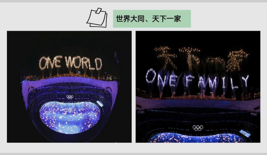 老师们向学生们普及了幕后冬奥村工作人员热情好客、志愿者们无私奉献的温暖事迹,展示了闭幕式上“天下一家”的精彩图景。以此为出发点,向学生们讲述中国以奥林匹克盛会为契机,积极推动构建人类命运共同体的外交主张。天下一家、世界大同的和谐精神,在学生们的心中播撒和平友爱的种子,教导他们以更加包容开放的心态放眼世界。