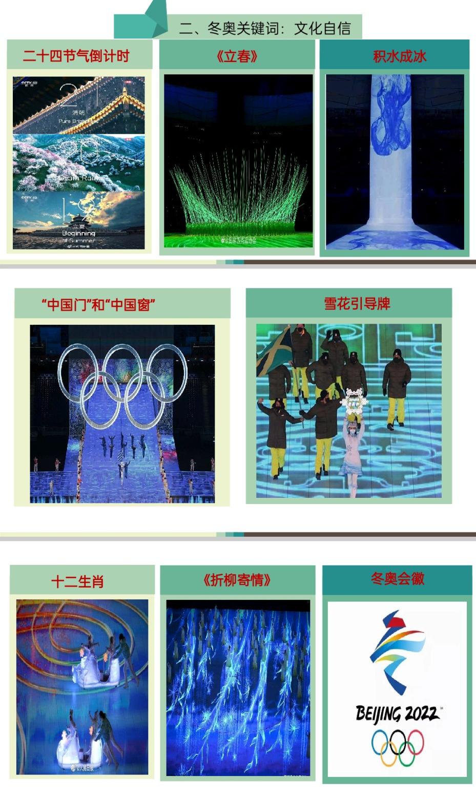 老师向学生们展示开幕式美轮美奂的场景,将其中蕴含的文化自信娓娓道来。开幕式把24节气作为倒计时创意,将祖国各地的魅力风景和冰雪健儿的运动场景交相辉映,向世界展示中华民族特有的历史文化积淀;“有朋自远方来迎客相见,天涯海角惜别垂柳相送”,闭幕式的折柳呼应开幕式的迎客松,是中华优秀传统文化与新时代元素的融合,既饱含丰厚的历史文化底蕴,又充满了时代感和未来感。在讲述中,使学生们增强文化自豪感和民族自信心,从心底深处热爱我们的中华文化,热爱我们的祖国。