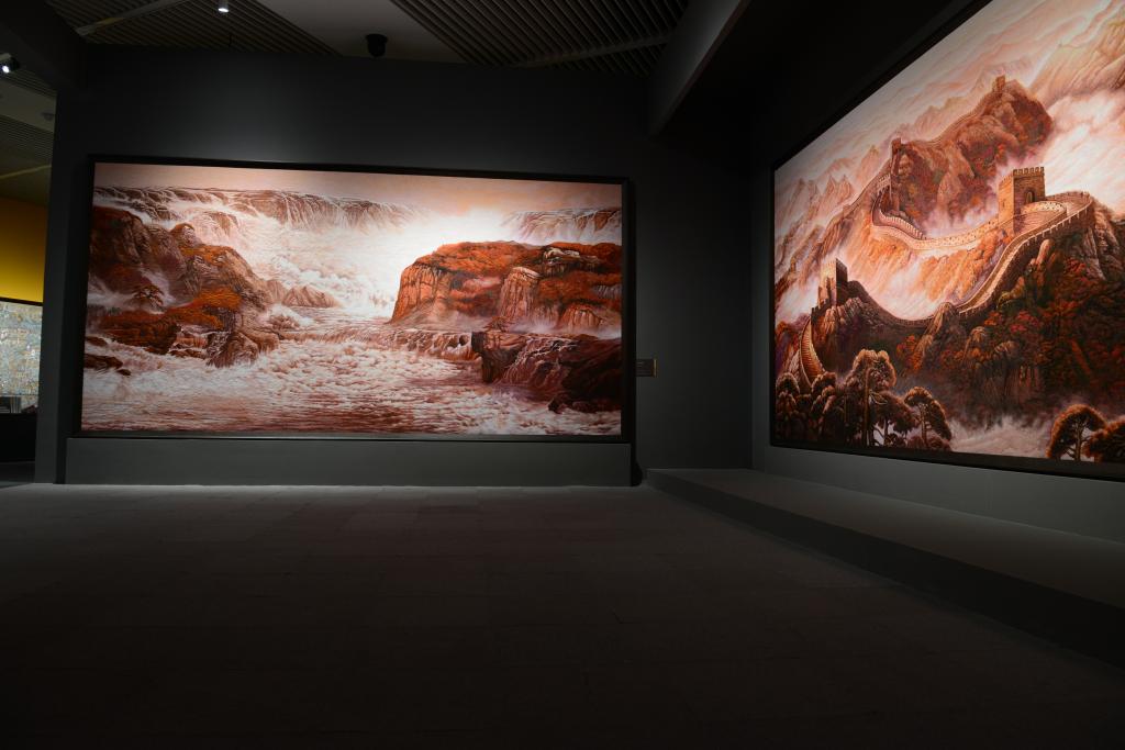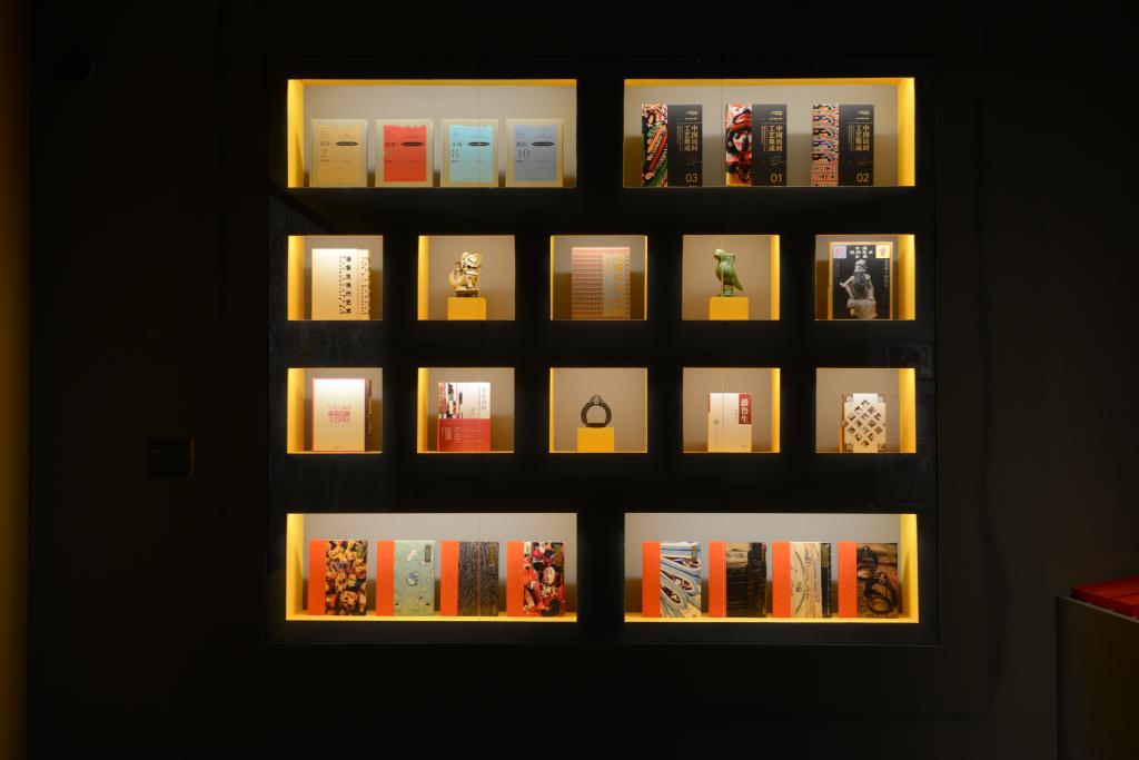 “到民间去”,是当代学者潘鲁生从事民艺研究与艺术创作的实践路径。民艺藏品捐赠部分,展示的是潘鲁生向中国国家博物馆捐赠的300件藏品精选,其中包含民间彩印花布、手工织毯、年画、剪纸、灯具、玩具、陶瓷、皮影等十个品类。民间元素创作部分,呈现的是《大匠丝路》《民族脊梁》《中流砥柱》等宏幅巨制,以及潘鲁生以民艺元素为基础在瓷板、金属板、丝绸等媒材上创作的艺术精品。民间文艺研究部分,是潘鲁生四十年“到民间去”民艺研究学术成果的集中展现,其中包含《民艺学论纲》《民间工艺学》《设计论》《美在乡村》等重要民艺著作。