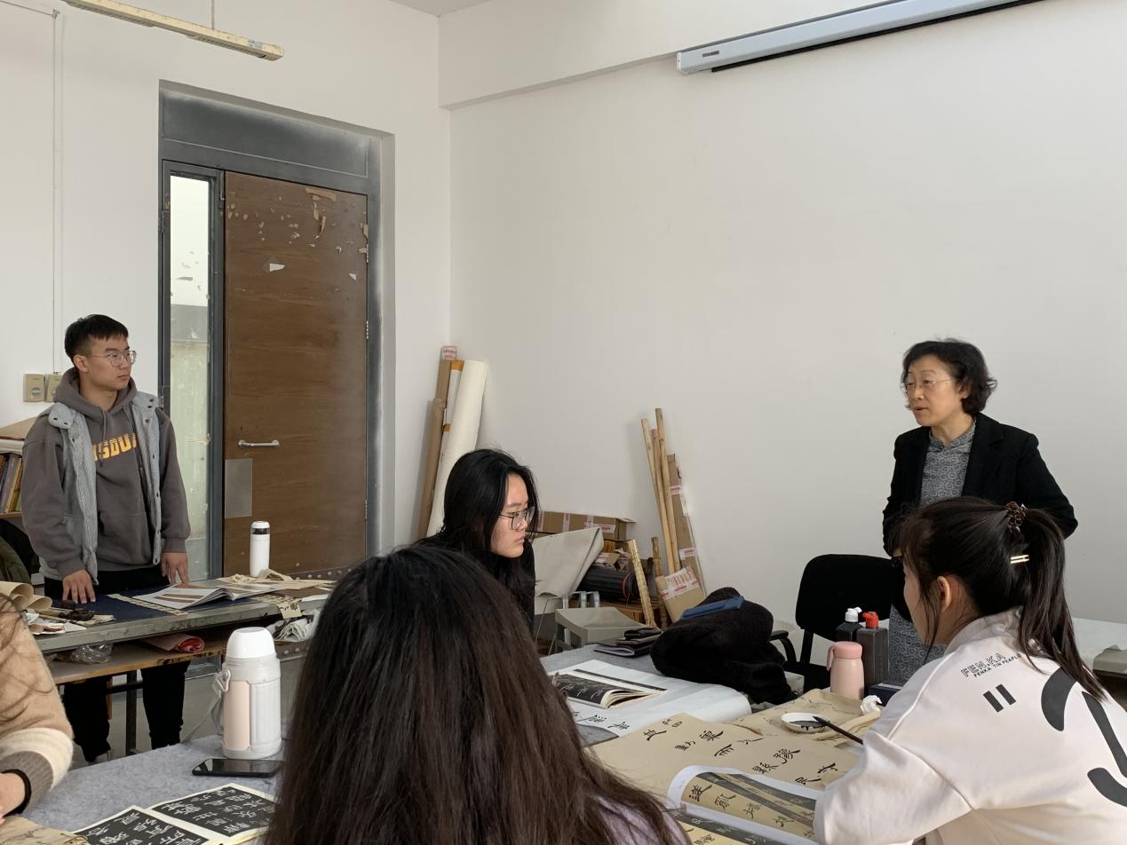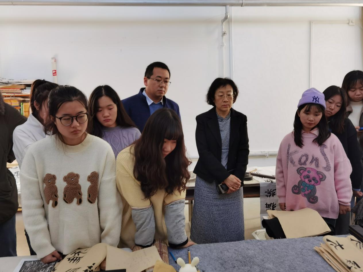 10日上午,19级书法班正在上《隶书创作》课。任课教师宋玖安就学习内容、学习模式、课时安排等做了基本介绍,随后,在教学中耐心讲解、认真示范,又挑选学生现场书写练习,找出存在问题,进行针对性教学。李新在听课后对授课教师的教学态度、教学方法、基本素养和实际效果等多个方面给予肯定评价,鼓励同学们坚定理想信念,在夯实专业技能的基础上开阔视野,不断拓展丰富综合素质,促进身心全面发展。