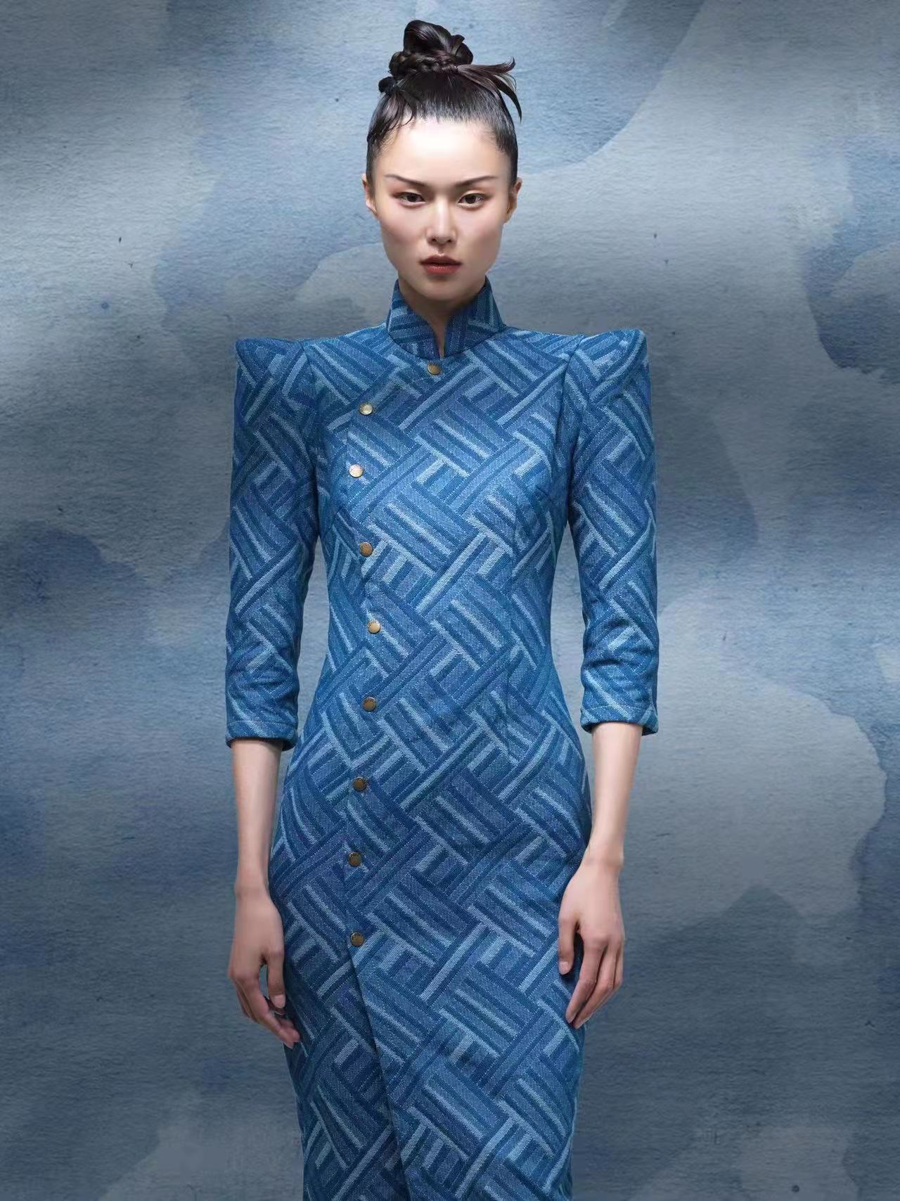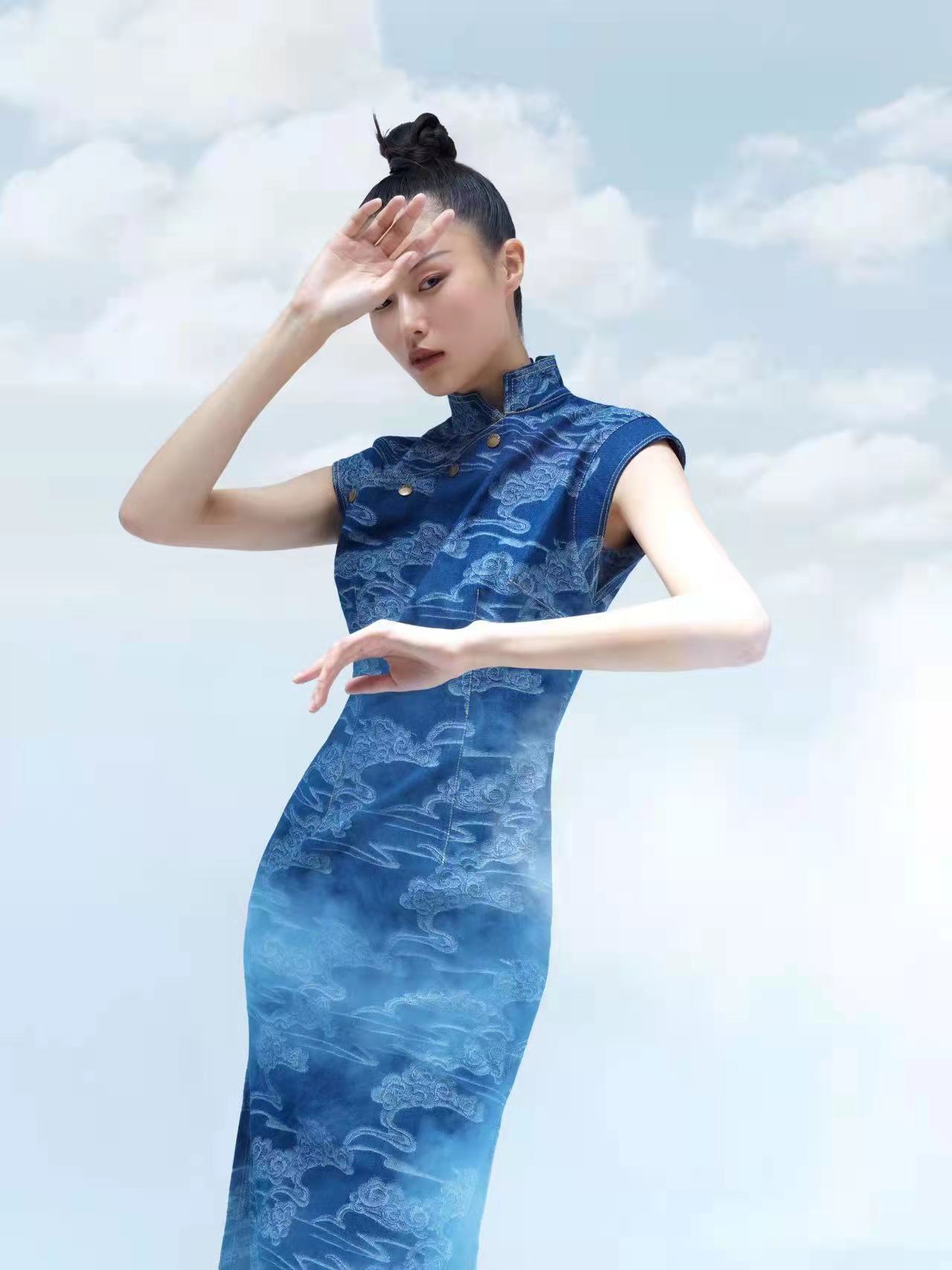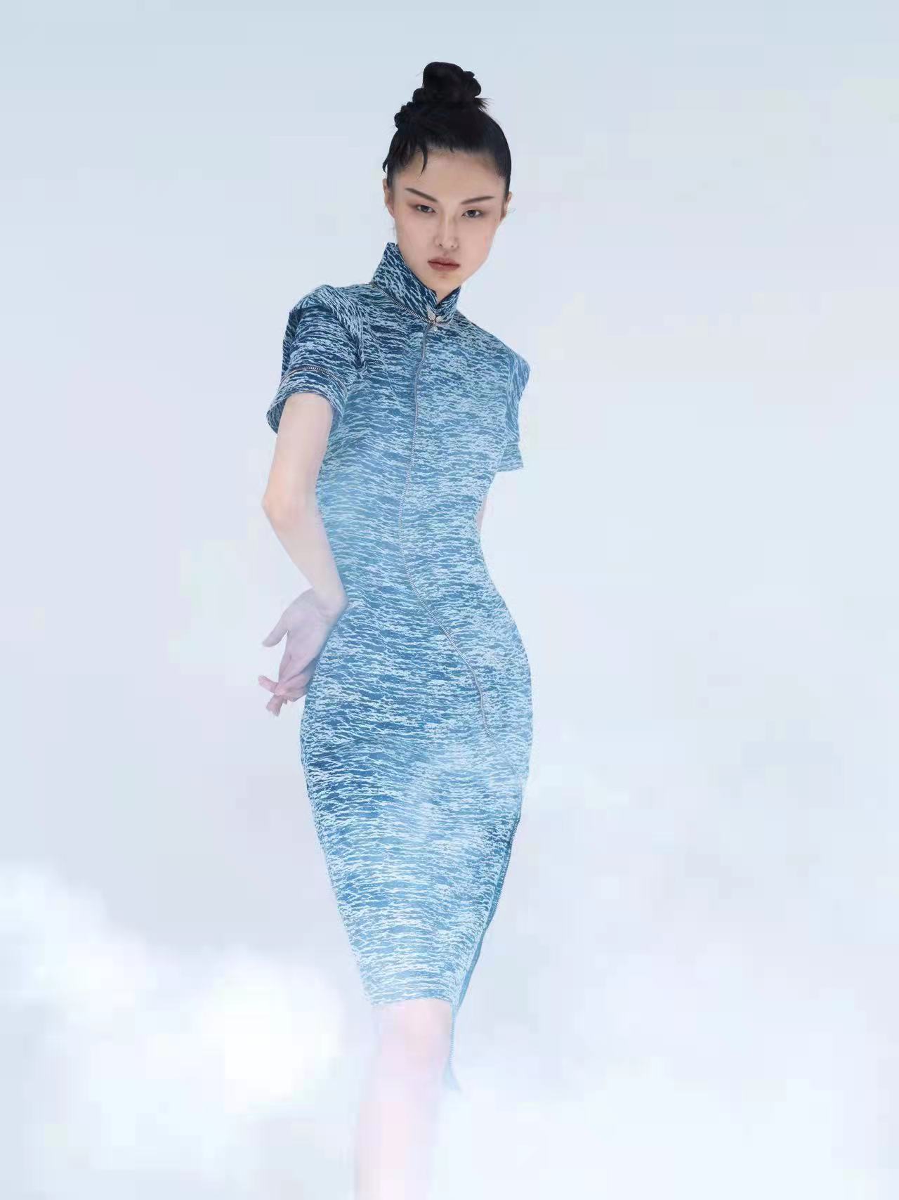 在展览现场,一组旗袍也吸引了不少人的目光。这是设计师邹渊的作品。在设计之初,设计师先进行以年轻人为对象的网络调研,调研表明年轻人更倾向的几个设计要点:设计时尚,长度适中,色彩简单,面料舒适,减少装饰。根据调研结果设计师首先确定现代感和休闲感较强的牛仔和针织面料。不做过多的传统装饰,款式上简洁,材料上新颖,用代表年轻人力量感的廓形设计在视觉上挑战传统旗袍的重工艺。白色针织面料的设计主题《天空之境》,款式尽量简单,依靠面料本身丰富的立体机理变化,希望打造出干净通透内心柔软的设计气氛。蓝色牛仔面料的设计主题《倾城》,取谐音“青城”,以靛蓝之青,用结构表现城市钢筋水泥的现代设计感。