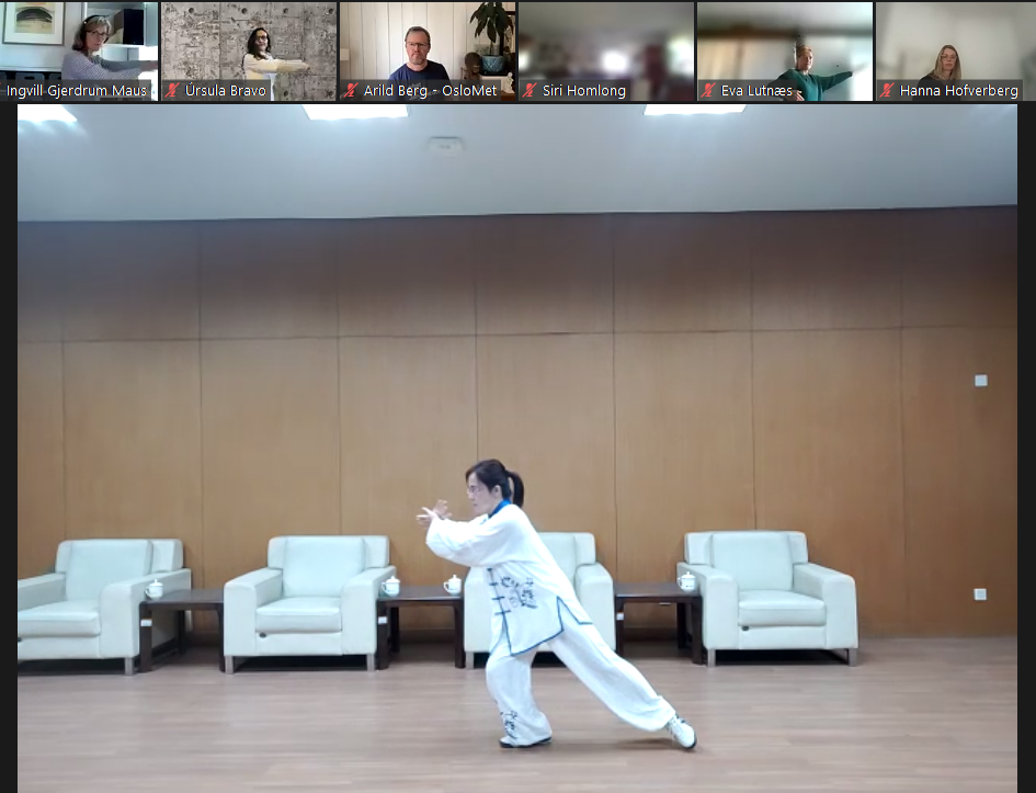 公共课教学部冯玉娟老师对中国传统健身气功八段锦进行了讲解示范。她介绍,八段锦起源于中国宋代,至今已有800多年的历史,以呼吸的调整、身体活动的调整和意识的调整为手段,以强身健体、开发潜能,体现了中国的天人合一,人和自然合一,形神合一的整体观。 随后,伴随着优美舒缓的音乐,她带领大家一起练习八段锦,动作柔和缓慢,圆活连贯,这种新颖的茶歇放松方式另大家尤其是国外参会者耳目一新,激发了大家对中国传统文化的兴趣。此外,她还为大家进行了精彩的太极拳表演,深受参会者的好评与喜爱。