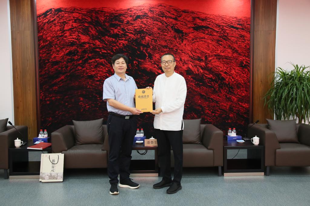 会上,巨野县书画院向学校捐赠上合组织青岛峰会工笔牡丹画《花开盛世》线稿。潘鲁生代表学校为巨野县书画院颁发捐赠证书。