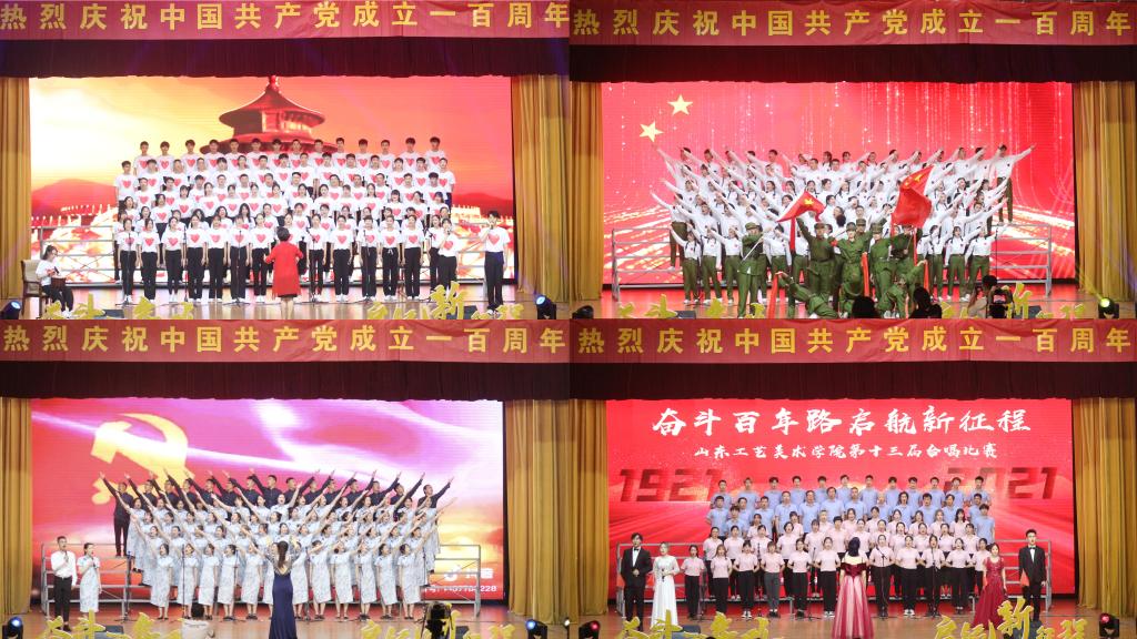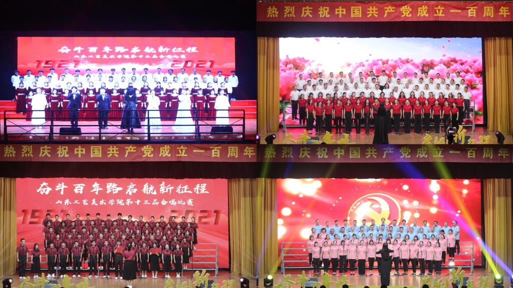 应用设计学院、继续教育学院、附中代表队,造型艺术学院和现代手工艺学院代表队,工业设计学院和人文艺术学院代表队凭借富有感染力的演唱摘得桂冠;服装学院和思想政治理论研究部代表队、视觉传达设计学院和建筑与景观设计学院代表队、教研党总支代表队、数字艺术与传媒学院和公共课教学部代表队获得二等奖;国家产教融合青岛基地代表队、创新创业学院代表队、机关党总支代表队、后勤党总支、艺术与设计实践教学中心、图书馆代表队获得三等奖。