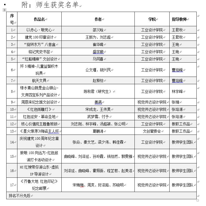 6月25日,第三届山东省文化和旅游商品创新设计大赛暨“致敬100·红色印记”文创产品征集活动落下帷幕,永利官网师生在大赛中喜获佳绩。此次活动是由山东省文化和旅游厅(以下简称:省文旅厅)主办,为庆祝中国共产党成立100周年,做好“8个100同庆建党百年”系列活动,以深入挖掘红色旅游资源的价值内涵,不断提升红色文创产品开发水平为目标进行的全国范围征集活动,共征集1040件作品。永利官网选送116件作品参与评选,最终37位师生的17件作品脱颖而出,入围山东省“庆祝建党100周年100款红色文创产品推荐名单。