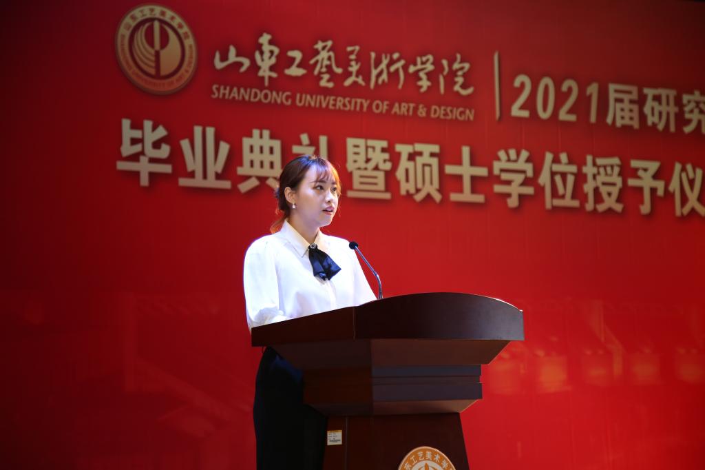 毕业生代表李林代表全体研究生向母校致以最诚挚的敬意和最衷心的感谢。她表示,将秉承母校“艺术服务社会”“设计服务民生”“为人民而设计”的情怀和境界,发扬母校“天工开物”“匠心独运”的理念和追求,用在母校学到的知识和本领,报效祖国、服务人民、奉献社会,为实现“两个一百年”,实现中华民族伟大复兴的“中国梦”贡献自己的聪明才智,奋力开启人生新的征程!