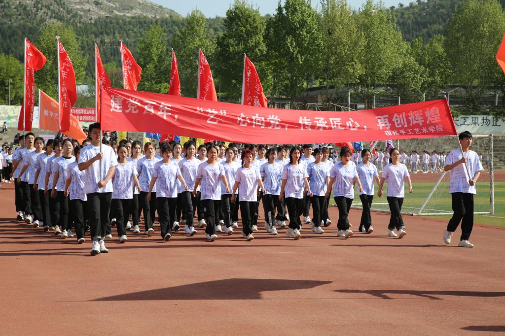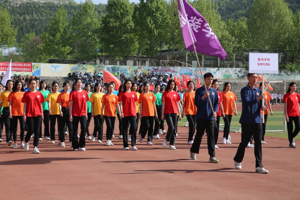 伴随着激昂的《运动员进行曲》,各学院代表队喊着嘹亮的口号,迈着统一整齐的步伐,在国旗护卫队的引领下依次入场。整个入场式隆重而欢快,充分展现了山工艺人精神饱满、斗志昂扬的精神面貌。