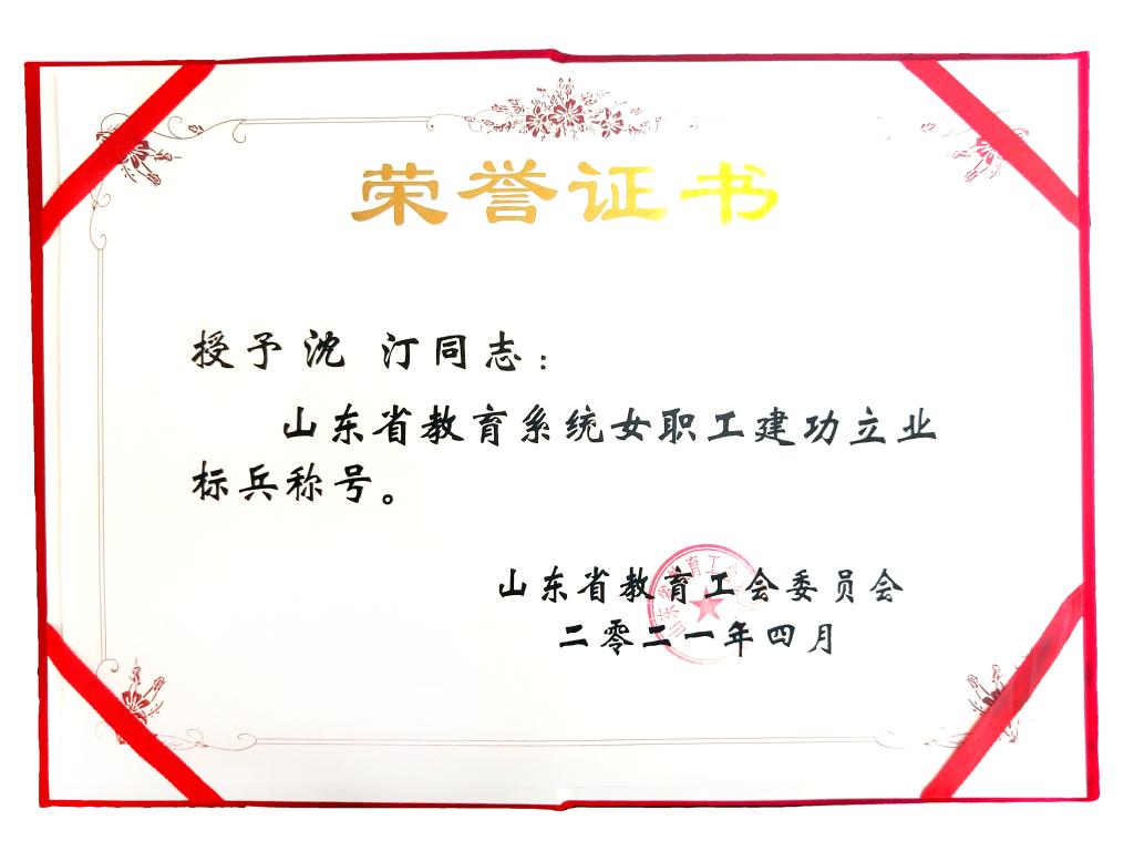 4月12日,山东省教育工会委员会印发了《关于公布全省教育系统女职工先进集体和先进个人的通知》,永利官网服装学院教师沈汀喜获山东省教育系统“女职工建功立业标兵”荣誉称号。