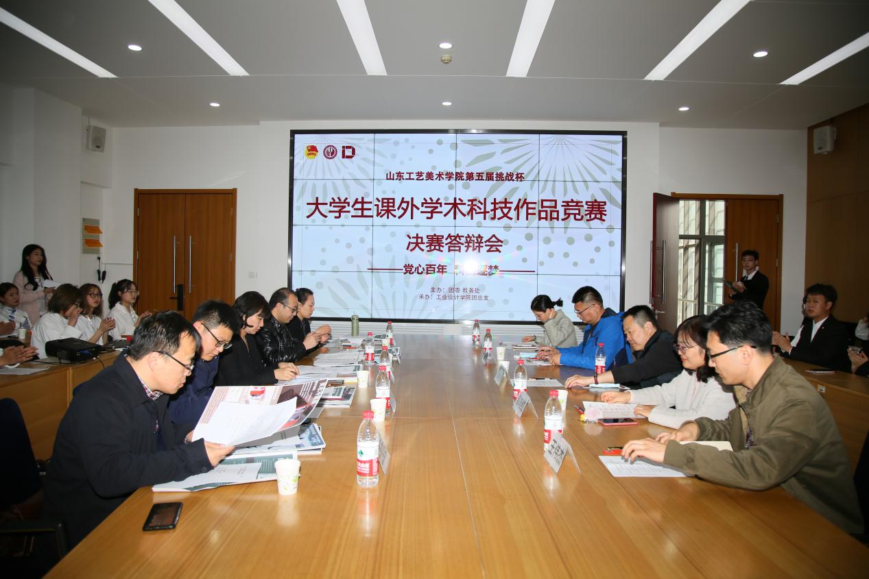 本次大赛分作品展示和现场答辩两个环节。参赛团队通过展板制作、实物展示、播放视频、团队宣讲对参赛作品进行展示讲解。决赛答辩会邀请齐鲁工业大学团委吴同发、山东建筑大学团委李建强、学校教务处副处长李蓉、人文艺术学院副教授王重远和工业设计学院副教授王艳担任评委。答辩会采用公开答辩的方式,分为团队陈述和专家问辩两个环节,17支参赛团队从作品的选题、创新意义、竞争优势、应用价值以及产品设计细节等方面阐述了项目作品,评委老师们就项目可行性、创新性等方面给出了专业的指导意见。