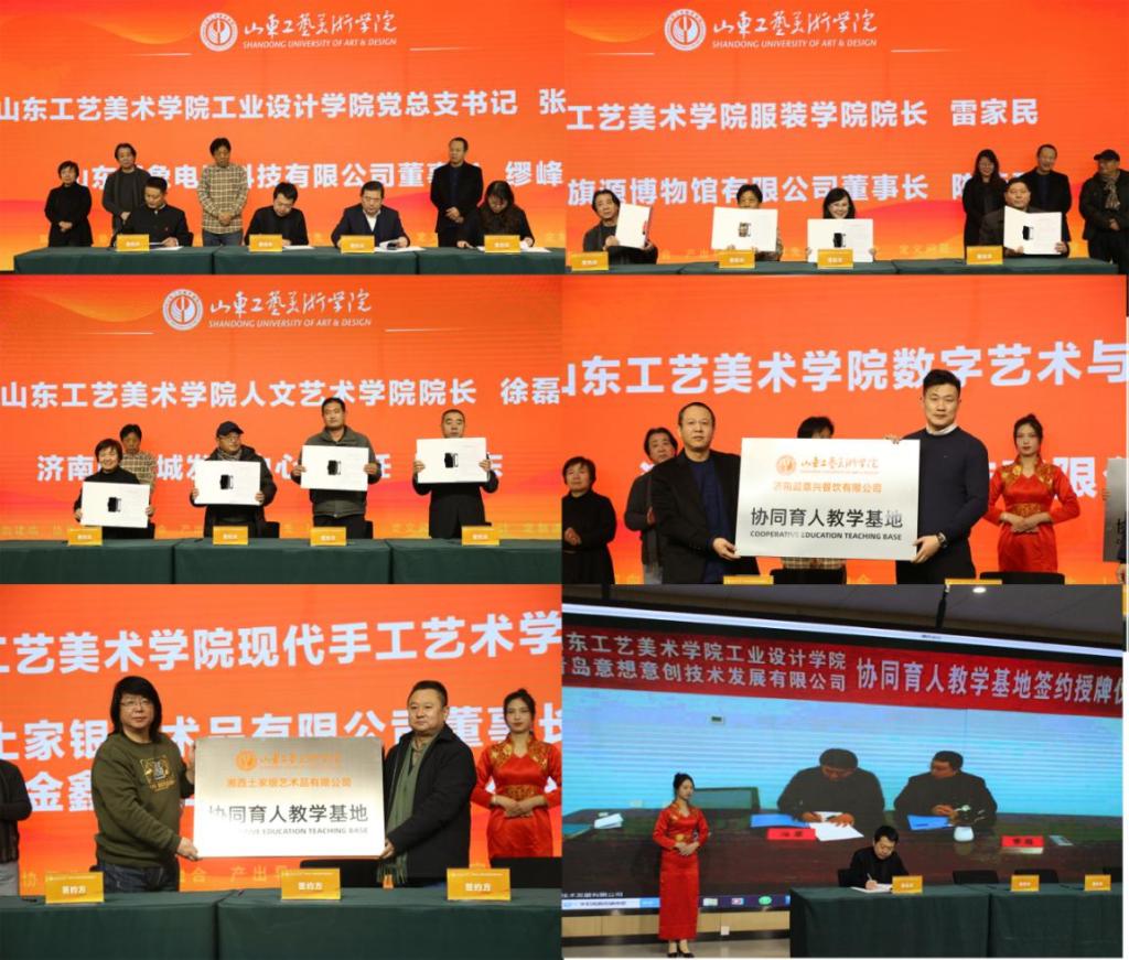 视觉传达设计学院、工业设计学院、服装学院、造型艺术学院、现代手工艺术学院、数字艺术与传媒学院、人文艺术学院、应用设计学院8家教学单位分别与山东宏济堂制药集团股份有限公司等18家企业现场签约授牌。