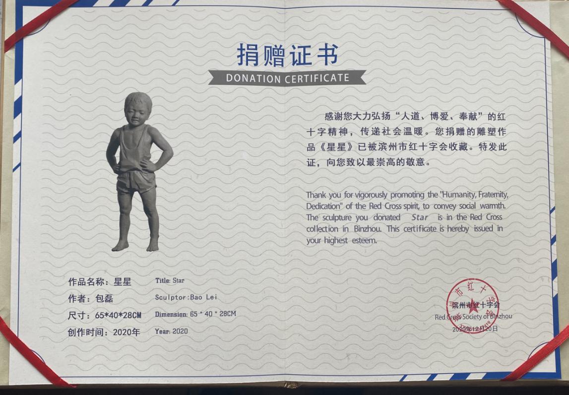2020年10月,yl8cc永利官网社会服务办公室包磊接受滨州市红十字会委托,为其创作雕塑,历经数月,几易其稿,完成雕塑作品《小星星》,并捐献给滨州市红十字文化主题公园长久存放。滨州市红十字会授予包磊捐赠证书。