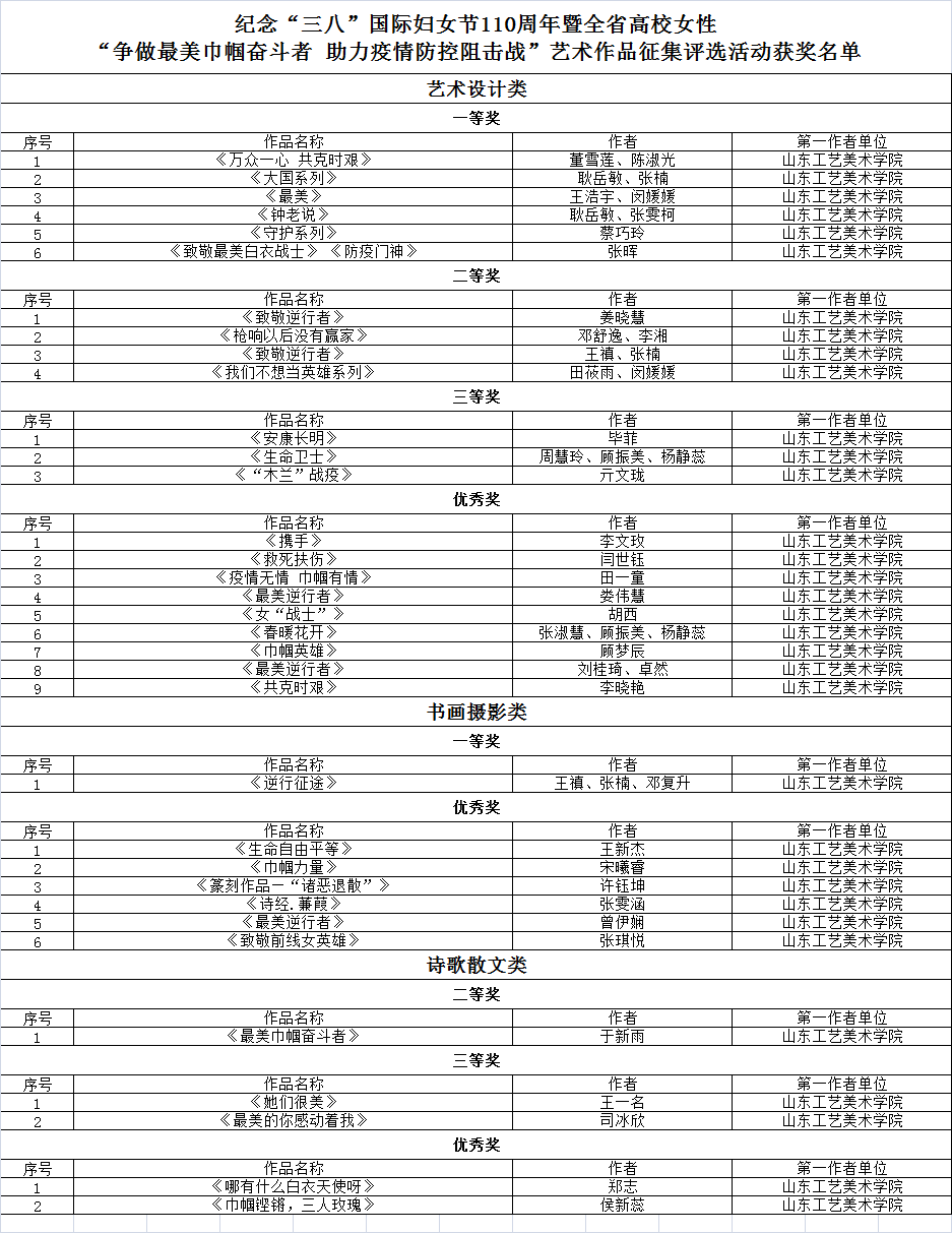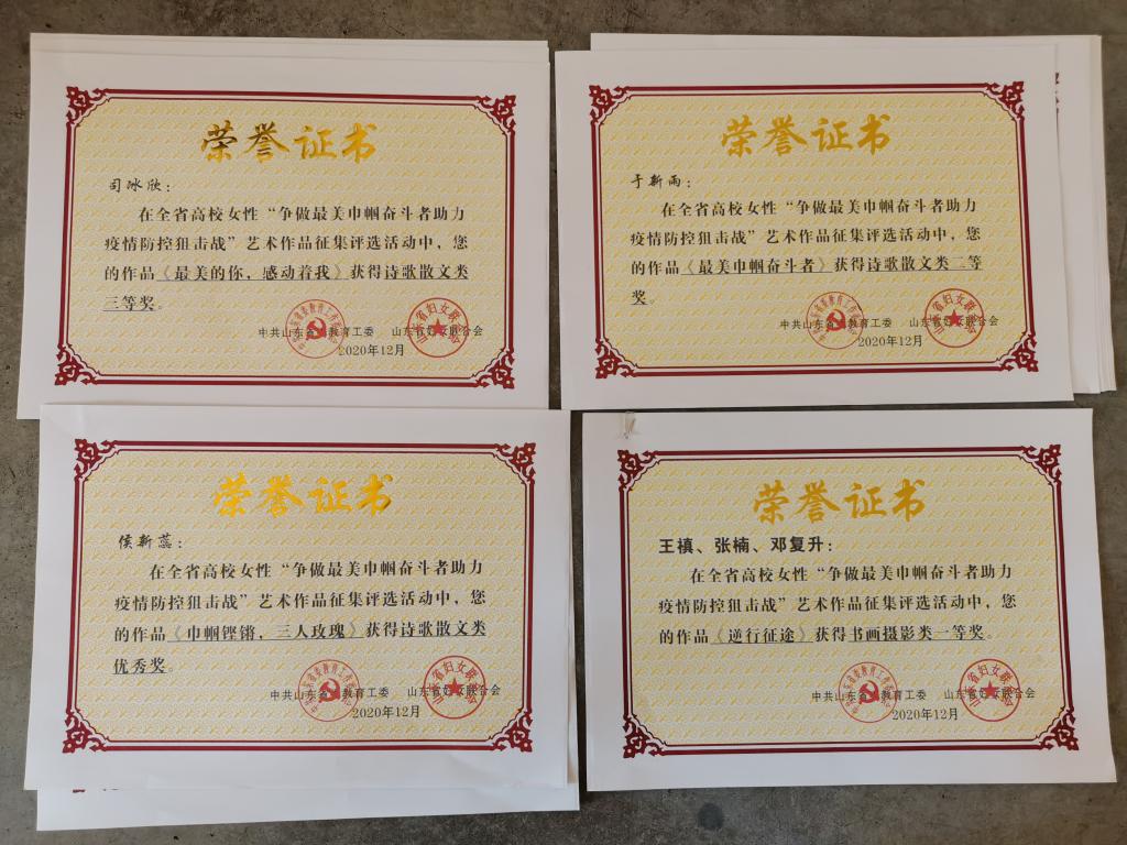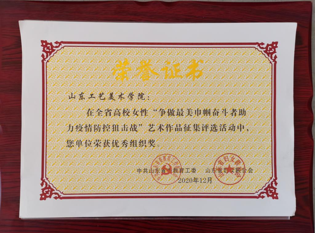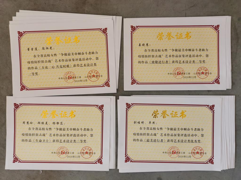 近日,中共山东省委教育工委、山东省妇联下发《关于通报表扬全省高校女性“争做最美巾帼奋斗者助力疫情防控阻击战”艺术作品征集评选活动获奖作品的通知》(鲁教工委函〔2020〕42号)。永利官网多名女性教师和女大学生在大赛中获奖。yl8cc永利官网评选为优秀组织奖。