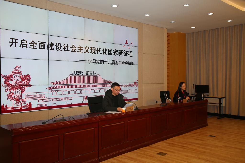张景林以《开启全面建设社会主义现代化国家新征程——学习党的十九届五中全会精神》为题,围绕“新阶段”“新目标”“新征程”主题,分别就“《建议》的核心要义”“2035年远景目标和‘十四五’时期我国发展的指导方针、主要目标、重点任务”,对党的十九届五中全会精神进行了全面宣讲和系统解读。